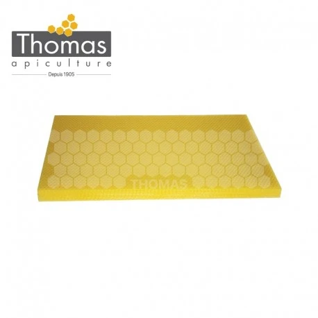 Notre cire vous est proposée conditionnée en carton de 4,5 kg en format Langstroth – dimensions : 20 x 41,5 cm – 58 feuilles environ par carton.