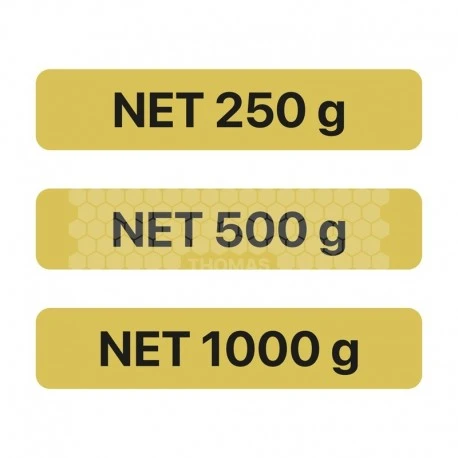 Ces étiquettes adhésives indiqueront la quantité du miel proposée à la vente. Cette mention est obligatoire pour la vente au détail de vos miels.