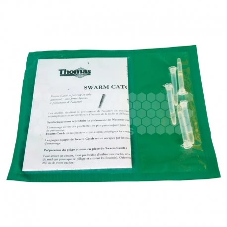 Synthétiquement reproduite, la phéromone de Nasanov est contenue dans « Swarm Catch » qui est un puissant attire-essaim se diffusant très lentement au travers de son contenant.